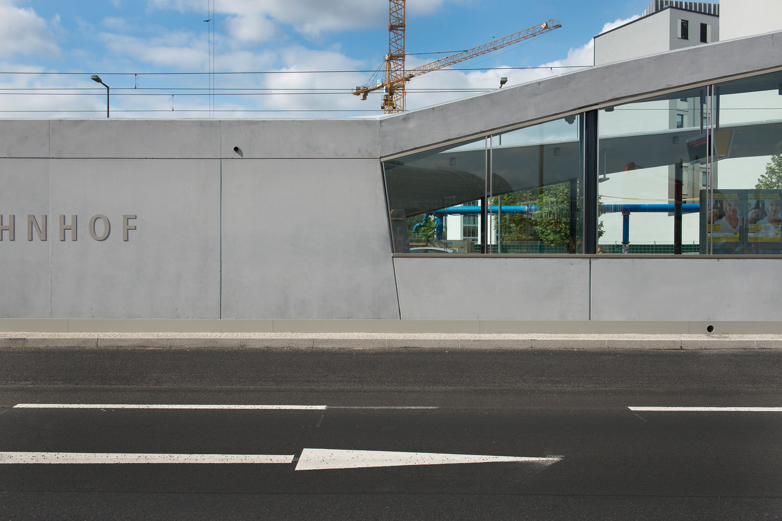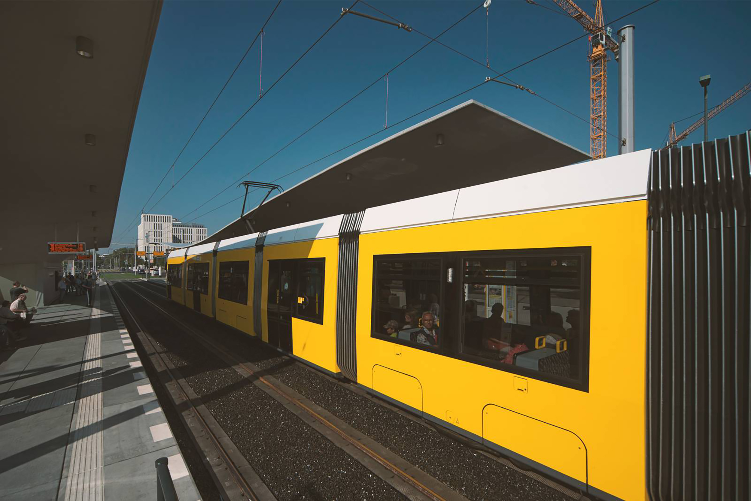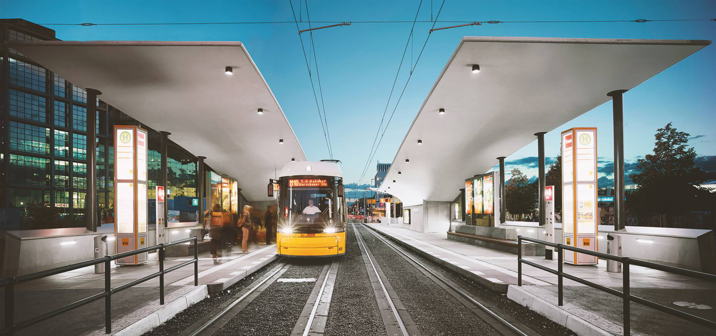 La parada de tranvía en la estación central sirve como punto de referencia para los viajeros y como un importante componente de infraestructura que conecta las partes este y oeste de la ciudad, antaño dividida. Inaugurada en 2015, la parada, ubicada en medio de la Invalidenstraße, se integra en el bullicio que rodea la estación principal. Las dos amplias cubiertas con sus largos parapetos de hormigón que dan a la calle ofrecen protección contra las inclemencias del tiempo y el caos del tráfico. 15.000 pasajeros disfrutan de este breve momento de paz en el ritmo de llegadas y salidas cada día.