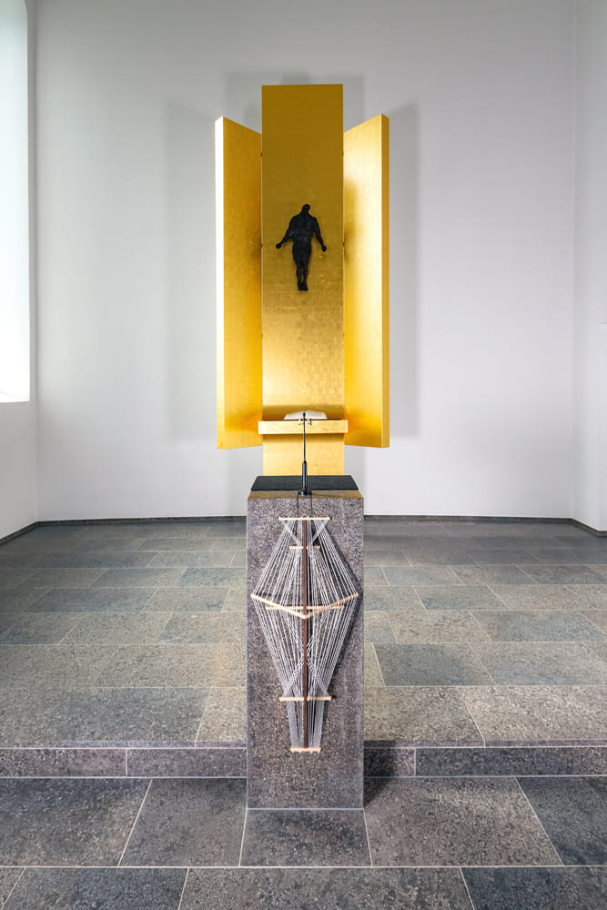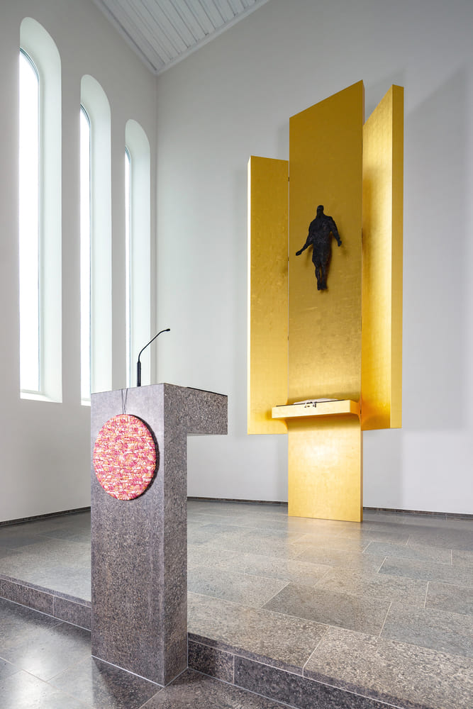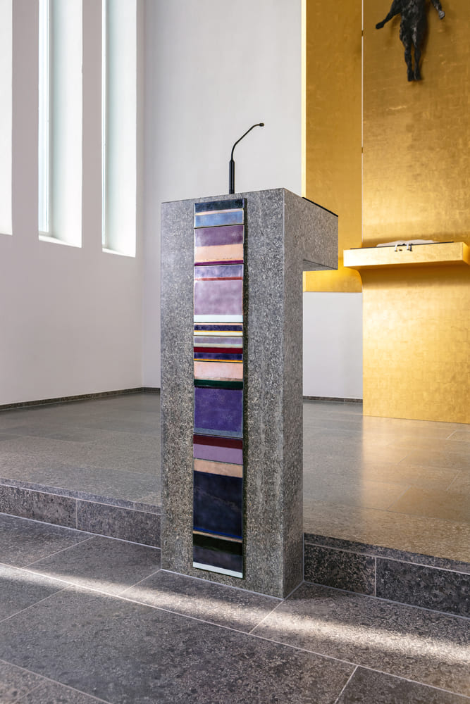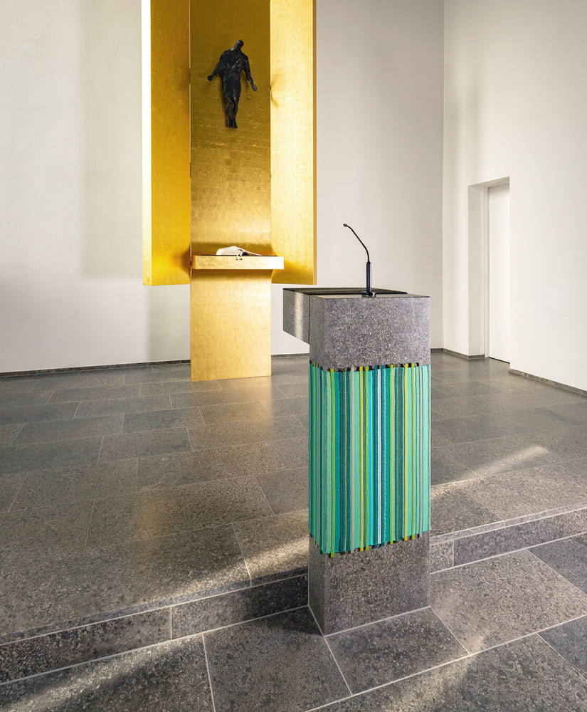 Partiendo de las líneas verticales y horizontales de la cruz, los cuatro paramentos para el ambón de una iglesia evangélica en Borken, Alemania, se basan en líneas.