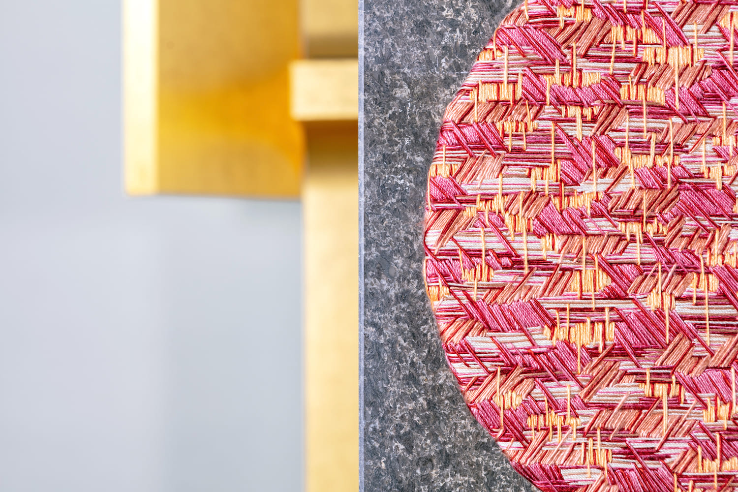 ROTE LINIEN (Líneas rojas) | bordado, seda teñida a mano | 38 x 38 x 1,5 cm | paramento para el ambón | Martin-Luther-Kirche Borken | Alemania | Anna Gawronski | 2019