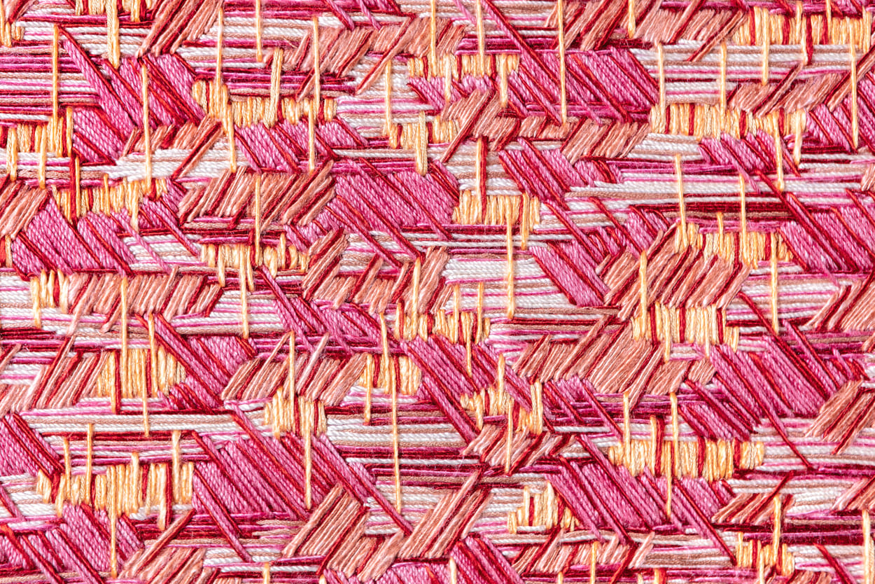 Las tiras de fieltro y el hilo crecen verticalmente en la tela verde. El esmalte violeta se compone principalmente de rayas horizontales. En el paramento rojo y blanco, la combinación de líneas verticales y horizontales definen las ocasiones especiales en las que se exponen las piezas.