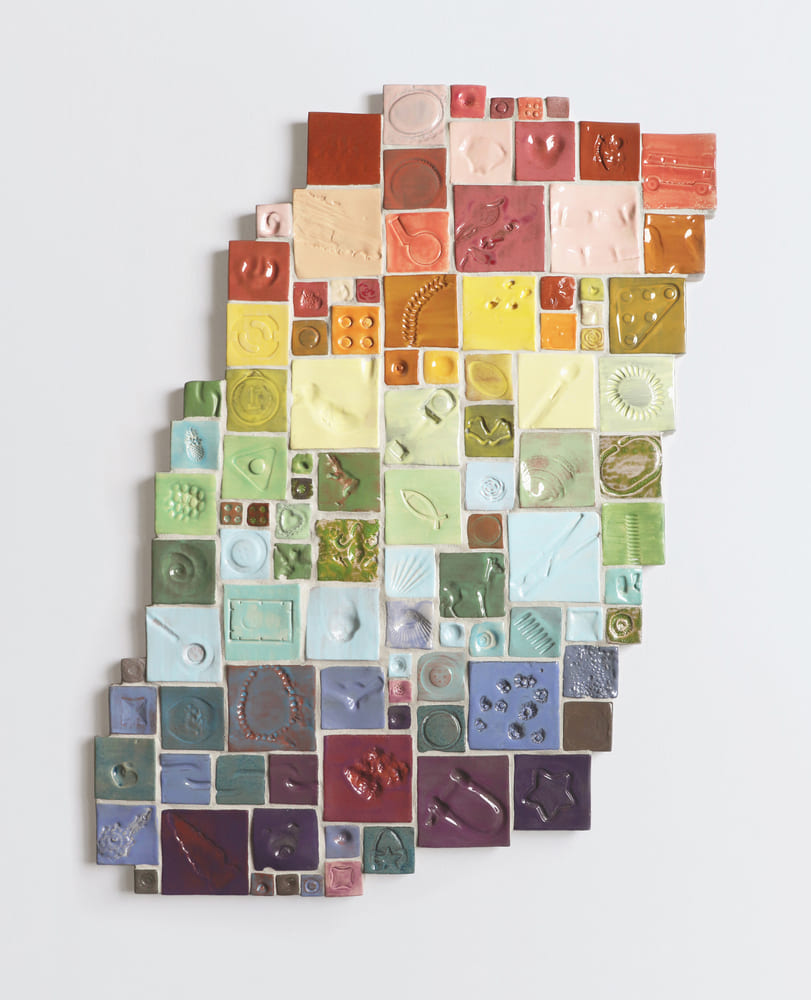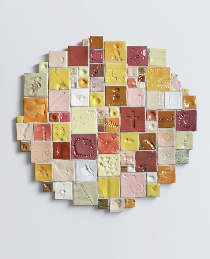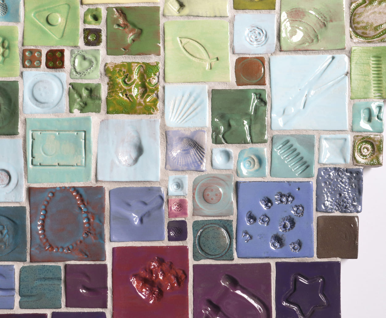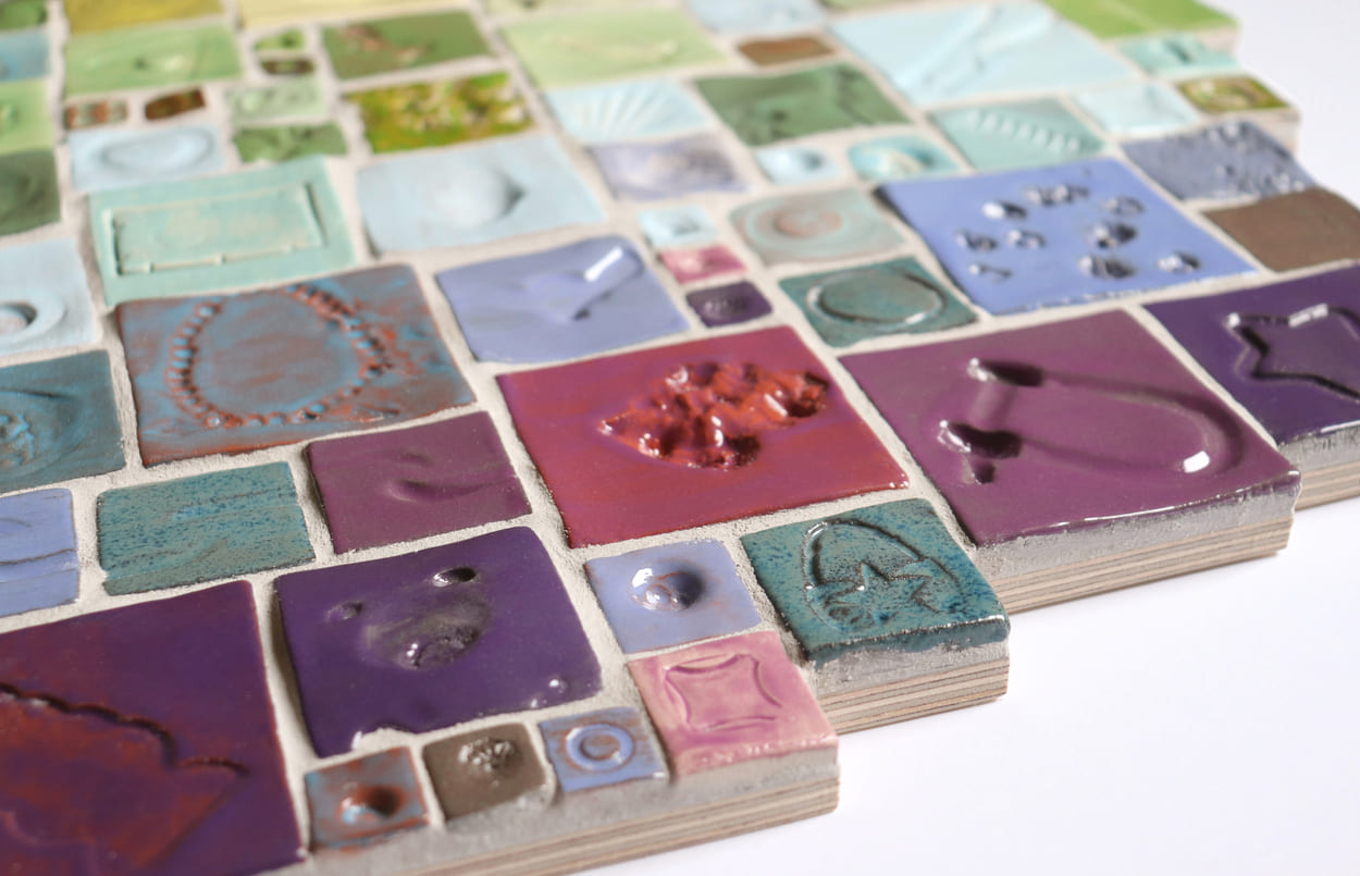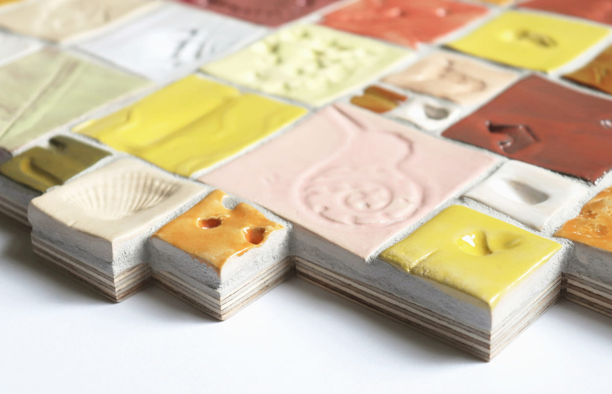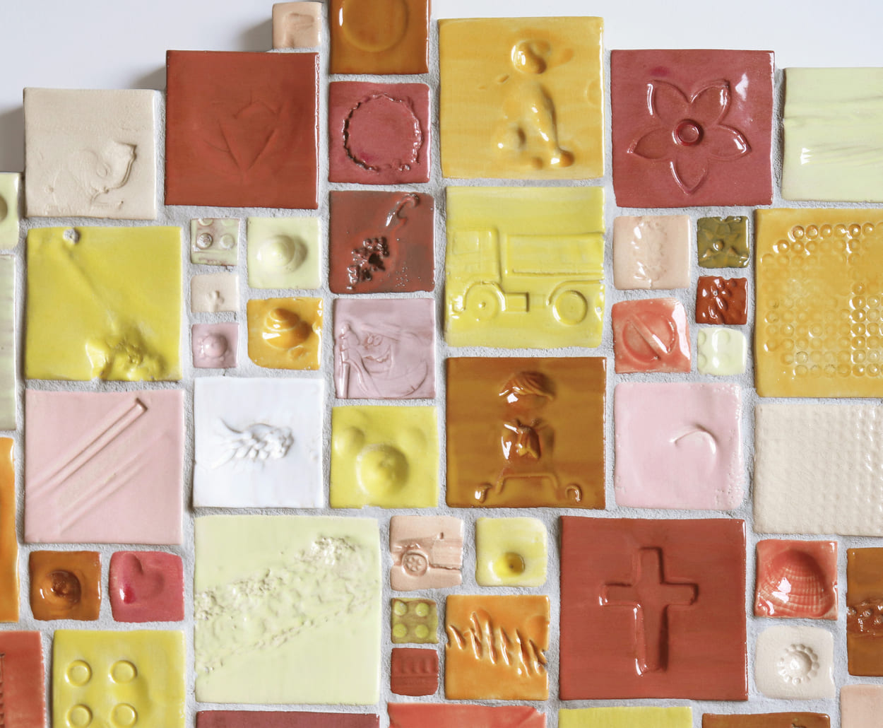 SCHATZSUCHE | mosaico cerámico | cooperación con una guardería de Berlín | Alemania | financiado por Berliner Projektfonds  | 45 x 45 x 2 cm y 48 x 45 x 2 cm | Anna Gawronski | 2021